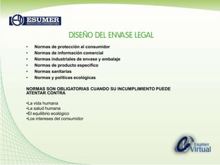 El documento presenta una descripción general de las normas y legislaciones aplicables a los empaques y embalajes a nivel internacional, haciendo énfasis en aspectos como la protección al consumidor, la salud y el medio ambiente. Se explican conceptos como las normas técnicas, la clasificación de la legislación, y los requisitos específicos en mercados como la Unión Europea, Estados Unidos y Colombia. Además, se mencionan consideraciones sobre restricciones y certificaciones necesarias para empaques en el comercio internacional.