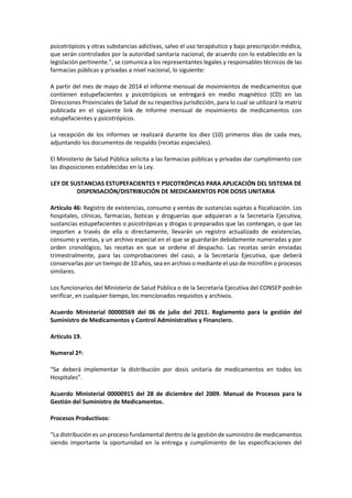 Este documento resume las leyes y regulaciones ecuatorianas relacionadas con medicamentos que contienen sustancias psicotrópicas y estupefacientes. Se prohíbe la venta y consumo de estas sustancias sin receta médica. Las farmacias deben presentar informes mensuales sobre el movimiento de estos medicamentos a las autoridades sanitarias. También se requiere implementar la distribución de medicamentos por dosis unitaria en los hospitales para mejorar el control y eficiencia en el manejo de medicamentos para pacientes hospitalizados.