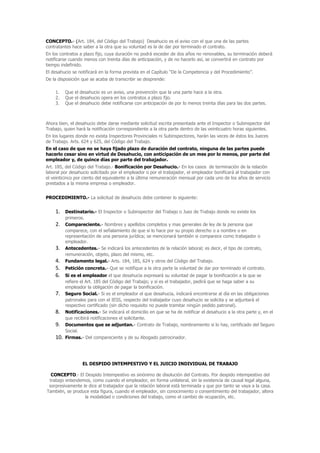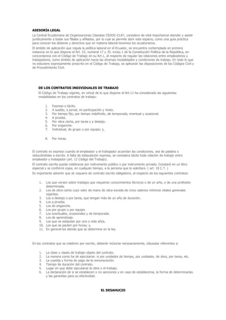 Este documento provee información sobre los derechos laborales de los trabajadores ecuatorianos. Explica que el Código de Trabajo y la Constitución regulan las relaciones laborales en el Ecuador. Resume los diferentes tipos de contratos de trabajo, el proceso de desahucio, el despido intempestivo y el derecho de los trabajadores a recibir utilidades. También ofrece detalles sobre cómo presentar una demanda por despido intempestivo ante el juez provincial del trabajo.