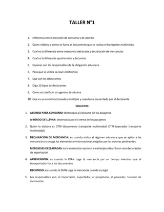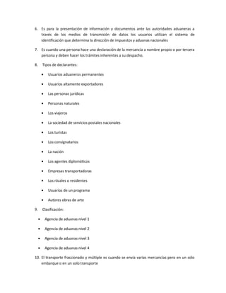 1) El documento presenta las diferencias entre provisión de consumo y de abordo, quien elabora el documento de transporte multimodal, la diferencia entre declaración de mercancías y mercancías declaradas, la diferencia entre aprehensión y decomiso, los responsables de la obligación aduanera y el uso de la clave electrónica. También explica qué son los declarantes y menciona 10 tipos de declarantes y cómo se clasifican los agentes de aduana. Por último, define qué es un envío fraccionado y múltiple y cuándo es present