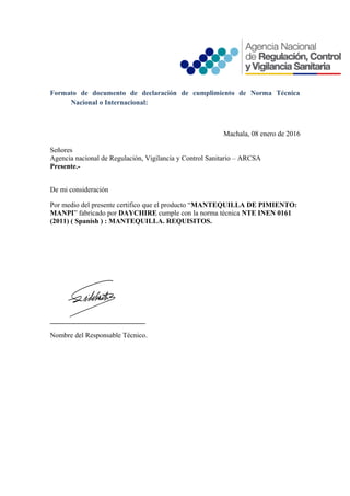 El documento proporciona formatos y certificados requeridos para la inscripción de un registro sanitario para el producto "MANTEQUILLA DE PIMIENTO: MANPI" fabricado por DAYSHIRE. Incluye declaraciones de cumplimiento con normas técnicas, especificaciones de calidad, diseño de etiqueta, tiempo de vida útil, materiales de envase y titular del registro sanitario.