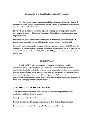 El documento describe las leyes y organizaciones relacionadas con la salud y seguridad laboral en Venezuela y Estados Unidos. En Venezuela, la Constitución es la ley fundamental y la LOPCYMAT establece normas para proteger a los trabajadores. En EEUU, la OSHA dicta normas de seguridad laboral y supervisa programas estatales. Ambos países buscan reducir riesgos laborales y proteger a los trabajadores.