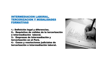 Este documento presenta información sobre intermediación laboral y tercerización en Perú. Explica las definiciones legales de intermediación laboral y tercerización, los requisitos para su validez, y los tipos de empresas de intermediación. También resume casos judiciales relevantes y presenta lineamientos para distinguir tercerización legítima de aquellas que enmascaran una relación laboral directa.