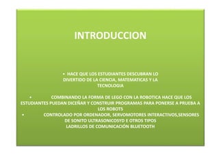 Este documento presenta el Lego Mindstorms, un conjunto de construcción y programación robótica educativa. Explica cómo los estudiantes pueden diseñar y construir robots usando piezas de Lego y luego programarlos usando software de computadora. Detalla los diferentes sensores como táctiles, de sonido y ultrasónicos que pueden usarse en los robots, así como cómo conectar motores y descargar programas al robot a través de Bluetooth o USB.