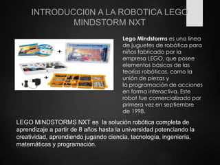 El documento describe el robot LEGO Mindstorms NXT, incluyendo su historia, componentes y especificaciones. El Mindstorms NXT es un robot educativo que potencia la creatividad y el aprendizaje de ciencia, tecnología, ingeniería y matemáticas a través de la programación y construcción de robots con piezas LEGO.