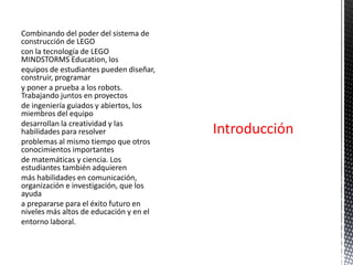 Este documento describe el uso del sistema LEGO MINDSTORMS Education para que los equipos de estudiantes diseñen, construyan, programen y prueben robots. Los estudiantes desarrollan habilidades de resolución de problemas y creatividad mientras aprenden conceptos de matemáticas y ciencia. El documento también explica los componentes del sistema, incluido el ladrillo inteligente NXT, sensores, motores y cómo conectarlos.