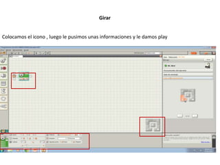 El documento describe tres programas para un robot Lego Mindstorms NXT. El primer programa hace girar al robot colocando el icono de giro y ejecutándolo. El segundo cambia la dirección del robot colocando el icono de cambio de sentido y ejecutándolo. El tercer programa hace que el robot avance un metro en un cuadrado, luego haga un círculo, retroceda 2 metros y muestre un emoticon hablado.