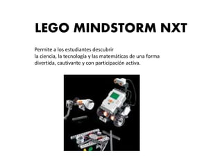 LEGO MINDSTORM NXT permite a los estudiantes aprender ciencia, tecnología y matemáticas de forma divertida mediante el diseño, construcción y programación de robots con piezas LEGO. Los estudiantes trabajan en equipo para resolver problemas de ingeniería, desarrollando habilidades como la creatividad y la resolución de problemas que los preparan para el éxito futuro. El kit incluye un ladrillo inteligente NXT, sensores, motores, lámparas y una batería para que los estudiantes creen robots interactivos.