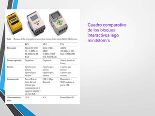Este documento presenta una comparación de los sensores incluidos en los bloques interactivos Lego Mindstorms NXT. Describe cinco sensores: táctil, acústico, fotosensible, ultrasonido y servomotor interactivo. Para cada sensor, explica brevemente sus funciones y capacidades de detección, así como sugerencias para su programación y uso.