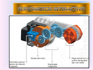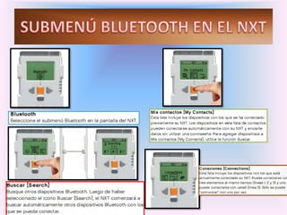 El documento presenta información sobre diferentes sensores y componentes que pueden utilizarse con un robot LEGO MINDSTORMS, incluyendo sensores de luz, ultrasonido y rotación, así como motores, lámparas y Bluetooth. Explica cómo conectar y probar cada componente usando la interfaz del NXT y crear programas sencillos.