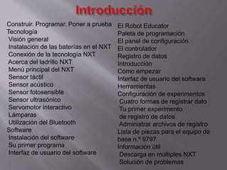 El documento proporciona información sobre la construcción y programación de robots con el sistema LEGO MINDSTORMS Education NXT. Explica cómo instalar las baterías y conectar sensores y motores al ladrillo NXT, y cómo programar el robot usando el software incluido. También describe cada uno de los cuatro sensores principales y sus funciones, y proporciona detalles técnicos sobre las especificaciones del ladrillo NXT.