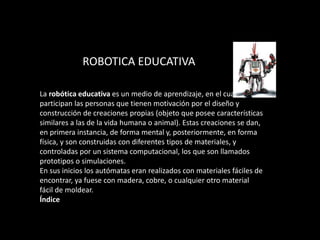 Lego Mindstorms es un sistema de robótica educativa fabricado por Lego que incluye piezas, motores y sensores para que los niños construyan y programen robots interactivos. Originalmente fue diseñado en colaboración con el MIT para enseñar principios básicos de robótica a través de la construcción y programación de robots hechos con piezas Lego. El documento también describe brevemente la historia de la robótica y los componentes clave del kit Lego Mindstorms NXT.