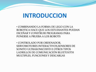 Este documento describe cómo construir y programar un robot utilizando piezas LEGO Mindstorms NXT. Explica cómo conectar sensores como el sensor táctil, acústico, fotosensible y ultrasónico, así como motores y lámparas al ladrillo NXT. También proporciona instrucciones para programar el robot utilizando el software LEGO Mindstorms NXT y poner a prueba el robot una vez programado.