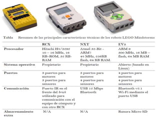 Este documento describe brevemente dos sensores del LEGO MINDSTORMS NXT: el sensor táctil y el sensor acústico. El sensor táctil es un interruptor que puede presionarse o liberarse, y puede programarse para cambiar el comportamiento de un modelo cuando se active. El sensor acústico mide los niveles de decibeles de un sonido y puede usarse para programar la respuesta de un modelo a diferentes sonidos.