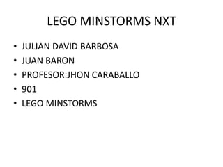 El documento describe la historia y componentes del sistema robótico educativo LEGO Mindstorms NXT/EV3. Explica que Mindstorms fue creado para enseñar ciencia, tecnología, ingeniería y matemáticas a través de la construcción y programación de robots. Detalla los componentes clave como el ladrillo inteligente, motores, y varios sensores como de sonido, distancia y color.