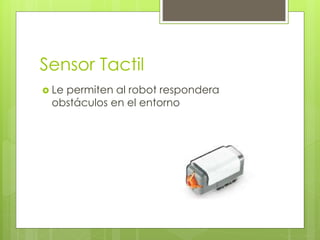 El documento describe los diferentes sensores y componentes del robot Lego NXT, incluyendo sensores táctiles, acústicos, fotosensibles y ultrasónicos que permiten al robot responder a su entorno, así como servomotores que aseguran el movimiento suave y preciso del robot y lámparas conversoras que pueden usarse para crear patrones de luz o activar otros componentes. También describe la tecnología Bluetooth que permite la comunicación inalámbrica entre el robot y otros dispositivos.