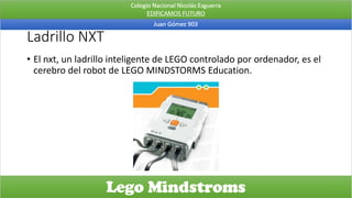 El documento proporciona una visión general de los componentes del sistema Lego Mindstorms NXT, incluyendo el ladrillo NXT que sirve como cerebro del robot, diversos sensores como táctiles, acústicos y fotosensibles que permiten al robot responder a su entorno, servomotores que controlan el movimiento del robot, y una batería recargable que alimenta el sistema.
