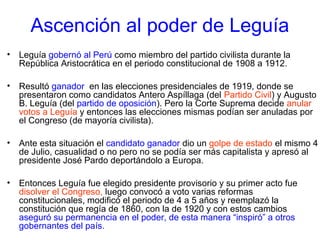 El documento describe el periodo de gobierno de Augusto B. Leguía en Perú conocido como el Oncenio (1919-1930). Leguía llegó al poder a través de un golpe de estado y gobernó de forma autoritaria. Realizó grandes obras públicas que modernizaron Lima, pero el país quedó fuertemente endeudado con préstamos estadounidenses. El modelo económico de entreguismo al capital extranjero llevó a una crisis cuando terminó la década de 1920.