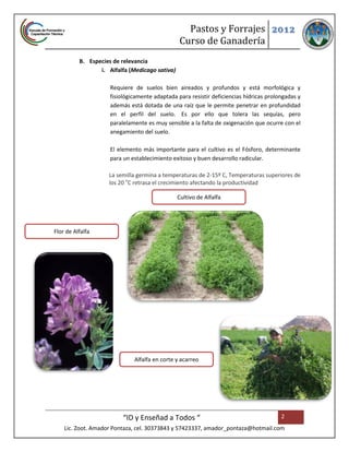 El documento trata sobre leguminosas forrajeras. Describe la morfología general de las leguminosas y destaca especies como la alfalfa, trébol blanco, trébol rojo, maní forrajero, chícharo de vaca, campanilla, frijol dolicus, soya, frijol gandul, leucaena, choreque, kudzú y pito; resaltando sus características de crecimiento, requerimientos ambientales y usos como forraje.
