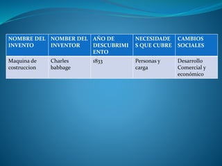El documento presenta una tabla que resume importantes inventos tecnológicos, incluyendo la maquina de construccion de Charles Babbage de 1833, las necesidades que cubrieron como carga y personas, y los cambios sociales como el desarrollo comercial y económico. Además, la tabla describe ventajas como el progreso y mejoras de habilidades contra desventajas como la adicción, desempleo y distracción.