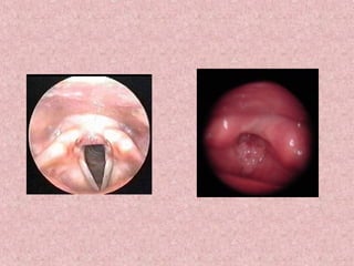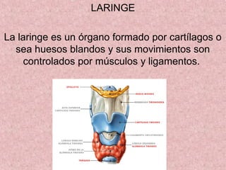 Este documento describe los principales órganos de la voz: la laringe, las cuerdas vocales y la glotis. La laringe está formada por cartílagos y controlada por músculos y ligamentos. Las cuerdas vocales, ubicadas en la laringe, son responsables de la producción del sonido al vibrar cuando el aire pasa. La glotis es el espacio entre las cuerdas vocales donde se produce realmente el sonido de la voz.