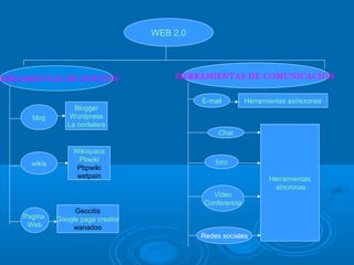 Este documento presenta información sobre las herramientas de la Web 2.0 para la edición y comunicación. Describe varias herramientas de edición como blogs, wikis y páginas web y plataformas populares como Blogger, WordPress y Wikispaces. También explica herramientas de comunicación síncronas como el chat y la videoconferencia, y asíncronas como el correo electrónico y los foros.