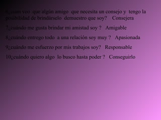 El documento presenta una lista de valores y defectos positivos y negativos. Los valores incluyen la sinceridad, alegría, honestidad, respeto, tolerancia, consejos, amistad, pasión, responsabilidad y logros. Los defectos son el orgullo, mal genio, impulsividad, envidia, antipatía, pereza, estrés, riesgo, despreocupación e impulsividad.