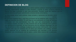Un blog es un sitio web en el que uno o varios autores publican artículos de forma cronológica, mostrando primero los más recientes. Los lectores pueden comentar activamente los artículos y los blogs suelen incluir características como hipermedia, facilidad de uso, búsquedas, etiquetas y suscripciones RSS.