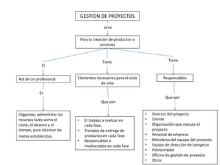 La gestión de proyectos sirve para organizar y administrar los recursos necesarios durante el ciclo de vida de un proyecto con el fin de crear productos o servicios y alcanzar las metas establecidas. La gestión de proyectos define el trabajo a realizar, los tiempos de entrega y los responsables en cada fase del proyecto, e involucra roles como el director del proyecto, el cliente, el equipo del proyecto y la oficina de gestión.