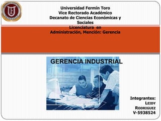 El documento habla sobre la gerencia industrial. Explica que la gerencia industrial es importante porque favorece la productividad dentro de las organizaciones. Sus objetivos son formar personal altamente capacitado y agregar conocimientos a los empleados. Se aplica en diferentes tipos de industrias como la pesada, ligera e industrias de equipo. Sus elementos incluyen actividades técnicas, comerciales y financieras como la producción, compra, venta y administración de capital.