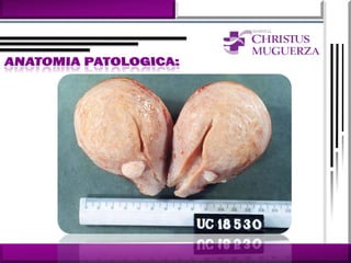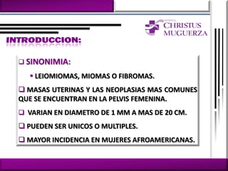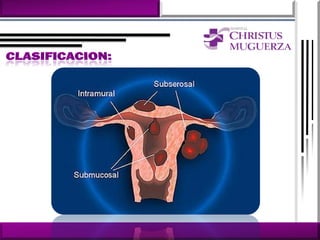 Los leiomiomas, también conocidos como miomas o fibromas, son neoplasias benignas uterinas que se originan de células de músculo liso y presentan mayor incidencia en mujeres afroamericanas. Pueden ser intramurales, submucosos o subserosos, y aunque a menudo son asintomáticos, pueden causar síntomas como sangrado uterino anormal y dolor. El tratamiento puede variar desde vigilancia expectante hasta intervenciones quirúrgicas, dependiendo de la severidad de los síntomas y el deseo de conservar la fertilidad.