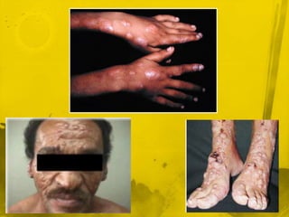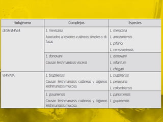 La leishmaniasis afecta a 12 millones de personas en 88 países, con 2 millones de nuevos casos por año. Se presenta en tres formas clínicas principales - cutánea, mucosa y visceral - siendo la visceral la más grave y la causante de la mayoría de muertes. El diagnóstico se realiza a través de exámenes microscópicos de biopsias de piel y médula ósea, así como pruebas serológicas. El tratamiento de primera línea consiste en antimoniados, aunque también se usan anf