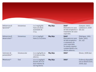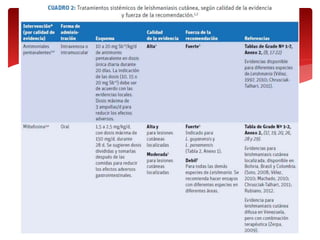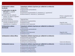 Las leishmaniasis son enfermedades parasitarias causadas por protozoos del género Leishmania que afectan la piel, las mucosas y los órganos internos. Más de 12 millones de personas están infectadas y 350 millones están en riesgo en 98 países endémicos. Existen tres formas clínicas principales: cutánea, mucocutánea y visceral. El diagnóstico se realiza mediante métodos directos, cultivo e inmunológicos y el tratamiento depende de la forma clínica y el estado del