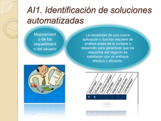 Este documento describe los objetivos y procesos relacionados con la adquisición e implementación de dominios de sistemas de información. Se enfoca en garantizar que las soluciones tecnológicas y de software satisfagan los requisitos del negocio de manera efectiva y eficiente a través de la identificación de necesidades, adquisición, mantenimiento, desarrollo e implementación de sistemas, así como la administración de cambios a la infraestructura tecnológica.