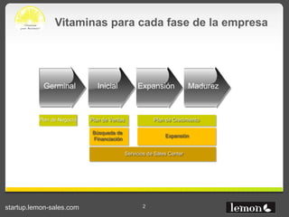 El documento presenta las "Vitaminas para Startups" de Lemon Sales, un servicio que ofrece diferentes módulos para apoyar las distintas etapas de crecimiento de una startup. Describe módulos para el plan de negocio, plan de ventas, búsqueda de financiación, crecimiento y madurez. Incluye también vitaminas específicas para la planificación de ventas, el crecimiento de las mismas y la generación de facturación al expandirse a nuevos mercados de bajo riesgo.