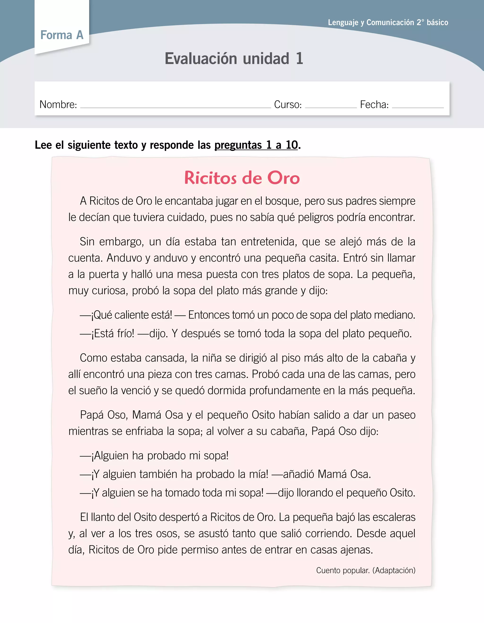 Ricitos de Oro se aleja de su casa en el bosque y encuentra una cabaña con tres platos de sopa. Prueba la sopa de cada plato y luego se queda dormida en una de las camas. Más tarde, los tres osos que viven en la cabaña encuentran que alguien ha probado su sopa. El llanto del osito despierta a Ricitos de Oro, quien se asusta al ver a los osos y huye a su casa.