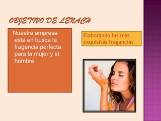 La empresa está buscando la fragancia perfecta para mujeres y hombres y ofrece una línea de perfumes juvenil y fresca, así como una línea para niños. A pesar de ser una empresa nueva, el equipo tiene experiencia en administración, contabilidad y elaboración de empresas que los respalda. El documento proporciona estadísticas que muestran la demanda de perfumes tanto para adultos como para niños.