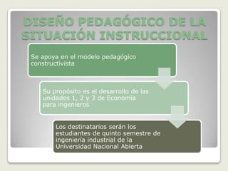 Este documento presenta el diseño pedagógico de una situación instructiva para las unidades 1, 2 y 3 de Economía para ingenieros en la Universidad Nacional Abierta. El diseño se basa en un enfoque constructivista y tiene como objetivo desarrollar la terminología básica, nomenclatura, definiciones, cálculos de interés simple y compuesto, valor presente, amortizaciones y valores futuros a través de estrategias individuales y colaborativas como material escrito, ejemplos prácticos y foros. El diseño también inclu