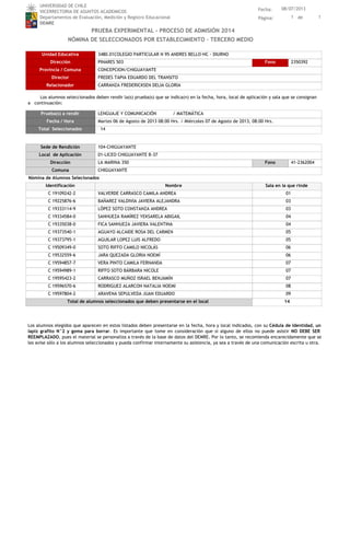 Este documento presenta una lista de 14 estudiantes seleccionados para rendir pruebas de admisión a la universidad en el Liceo Chiguayante. Incluye los nombres, identificaciones y salas de los estudiantes. También indica la dirección, teléfono y comuna del establecimiento, así como las fechas y horas en que los estudiantes deben presentarse para rendir las pruebas de Lenguaje y Comunicación o Matemática. Se solicita que solo los estudiantes seleccionados sean notificados para confirmar su asistencia a las