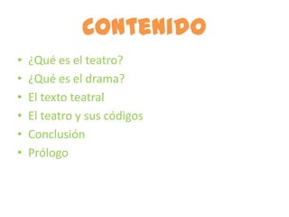 Este documento define el teatro y el drama, explica los diferentes tipos de texto teatral (primario y secundario), describe los códigos lingüísticos y no lingüísticos utilizados en el teatro, y brevemente analiza la conclusión y el prólogo como elementos teatrales.