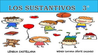 El documento trata sobre el sustantivo en lengua castellana, describiendo sus funciones, tipos y clasificaciones. Se abordan aspectos como el número, género, y ejemplos de sustantivos individuales, colectivos, concretos y abstractos. Además, se incluyen referencias bibliográficas y webgráficas para profundizar en el tema.