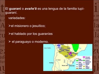 El guaraní es una lengua de la familia tupí-guaraní que tiene tres variedades principales: el misionero o jesuítico, el hablado por los guaraníes y el paraguayo o moderno. Usa un alfabeto de 12 vocales y 21 consonantes y se diferencian las palabras orales de las nasales.