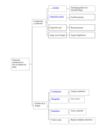 El documento presenta diferentes actividades relacionadas con la lectura, expresión oral y escrita, estudio de la lengua y juegos con el lenguaje como parte de una unidad didáctica. Incluye ejemplos de lectura de poemas, dar instrucciones, describir escenas, campos semánticos, uso de la c y cc, texto y párrafo y separar palabras para formar oraciones.