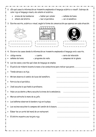 Este documento presenta varias situaciones y formas de comunicación e instruye a los estudiantes a identificar si la información se transmite a través del lenguaje verbal, no verbal, escrito u oral. Les pide subrayar, encerrar o escribir la forma de comunicación empleada en cada caso y también identificar el tipo de lenguaje utilizado.