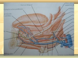 La lengua es un órgano móvil situado en la boca que desempeña funciones importantes como la masticación, deglución, lenguaje y sentido del gusto. Recibe inervación de los nervios hipogloso, glosofaríngeo y vago, y sensibilidad por los nervios lingual, glosofaríngeo y laríngeo interno. Su irrigación proviene de la arteria lingual, rama de la carótida externa, que da colaterales dorsales, hioides y sublinguales, y la arteria ranina riega la