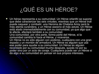 El documento describe el viaje del héroe y sus diferentes etapas, incluyendo la separación, iniciación y retorno. También explica qué es un héroe, cómo representan y ayudan a su comunidad, y la diferencia entre un héroe y un antihéroe o villano. Finalmente, da los ejemplos de Orfeo y El Cid para ilustrar el camino del héroe.