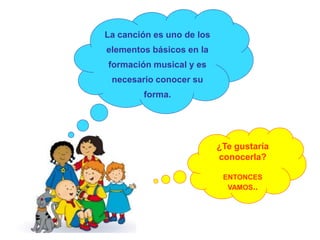 El documento introduce la forma canción y explica que está compuesta por una serie de estrofas y estribillos que siguen un patrón como AABB o ABACADAE. Describe que la frase musical permite estructurar la interpretación de una melodía cantada mediante un esquema de antecedente y consecuente, y que la forma rondó se caracteriza por repetir una serie de secciones musicales.