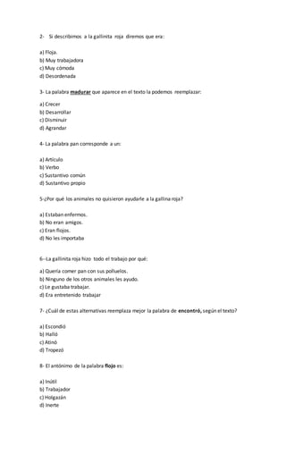 El documento es una prueba de nivelación de lenguaje y comunicación para estudiantes de 7° y 8° básico, que incluye textos de lectura y preguntas de opción múltiple. La prueba evalúa la comprensión lectora mediante un relato sobre una gallinita roja que realiza todas las tareas necesarias hasta hacer pan, así como un cuento sobre dos gorriones aprendiendo a volar. Los alumnos deben responder preguntas relacionadas con estos textos, que abarcan vocabulario, sinónimos, y clasificaciones gramaticales.