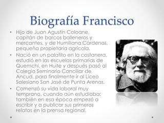 Este documento resume la biografía y obra del escritor chileno Francisco Coloane. Detalla que nació en una zona costera de Chile y estudió en varias escuelas antes de comenzar a trabajar y escribir a temprana edad. Se centró principalmente en los géneros narrativos de cuentos y novelas, siendo su obra más popular El Ultimo Grumete de la Baquedano. A lo largo de su carrera, publicó varios libros que exploraban temas de aventura y paisajes del sur de Chile.