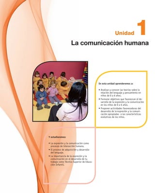 Este documento trata sobre la expresión y comunicación en niños de 0 a 6 años. Primero, resume los objetivos de aprendizaje como analizar teorías sobre la relación entre lenguaje y pensamiento en niños pequeños, formular objetivos para favorecer su desarrollo comunicativo, y proponer actividades apropiadas. Luego, examina conceptos como expresión, comunicación, lenguaje y sus funciones, y teorías sobre cómo los niños adquieren y desarrollan el lenguaje a través de la interacción social.